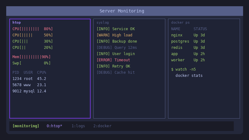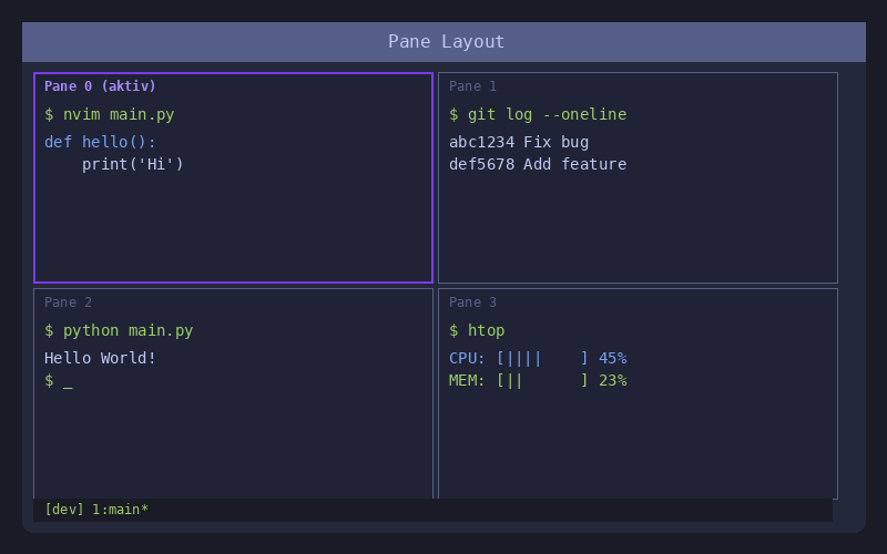 tmux Session mit mehreren Panes Eine typische tmux-Session mit mehreren Panes